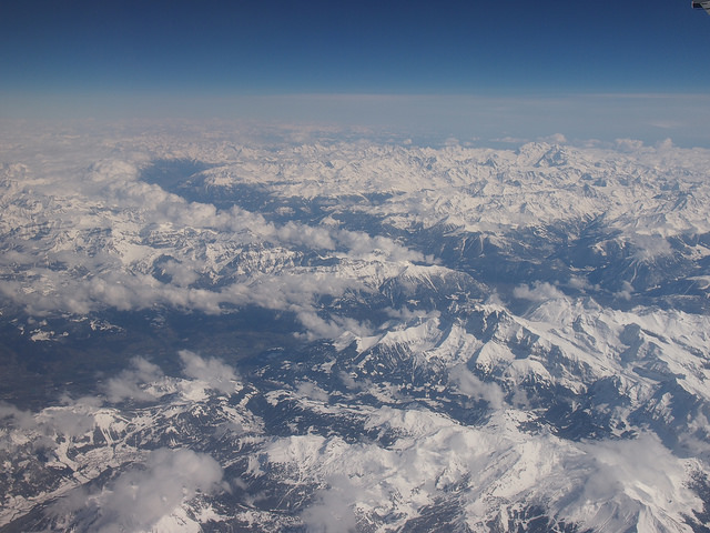 Die Alpen sind im März noch verschneit, hier vom Flieger aus fotografiert. Mallorca wird aber 20 Grad warm sein.