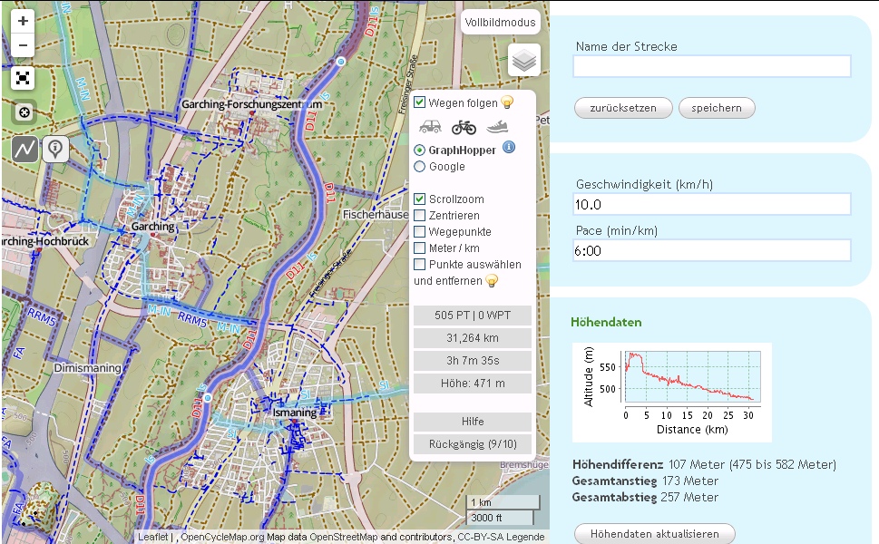 Für Radreisen empfehle ich daher, keine Routenplaner zu verwenden, sondern die Strecken selbst zu zeichnen. Die Mühe lohnt sich, da du jeden Schlenker oder Abstecher berücksichtigen kannst und schließlich der Weg das Ziel ist. Am geeignetsten dafür halte ich GPSIES. Hier kannst du etwa entlang der OpenCycleMap (oder auch zahlreichen anderen Karten) bequem Routen zeichnen, wobei nicht jeder einzelne Punkt gesetzt werden muss (aber auch kann). Außerdem wird das Höhenprofil schon in der Streckenerstellung angezeigt- genauso die Höhe über Meeresspiegel für jeden Kartenpunkt mithilfe des Cursors. Dadurch kannst du unnötige Steigungen umgehen oder eben einplanen. Außerdem kannst du nach vorhandenen Routen stöbern. Eine Alternative dazu ist die Bikemap.